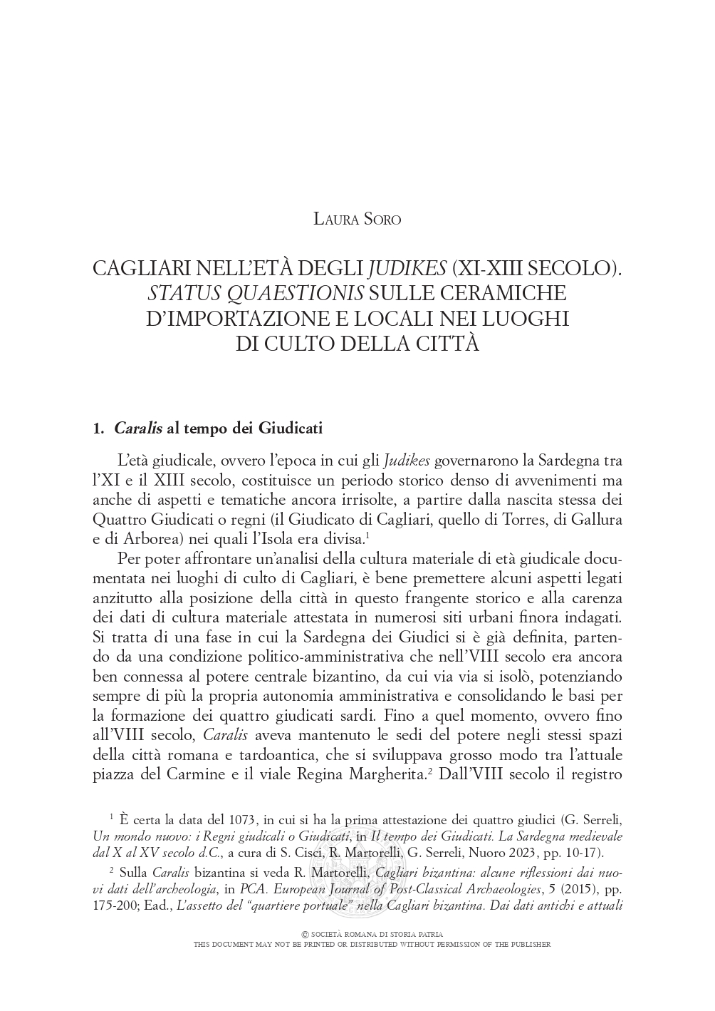 Il presente contributo mira a proporre una panoramica sulle ceramiche, locali e d’importazione, messe in luce presso i luoghi di culto attivi a Cagliari nel corso dell’età giudicale, periodo compreso tra XI e XIII secolo, in cui la Sardegna è divisa in quattro Giudicati. Tale tematica è resa complessa dall’intersezione di diversi fattori: tra tutte, le carenze conoscitive legate all’età giudicale, il popolamento di un’area suburbana in cui sorse la cittadella giudicale di S. Igia e la conseguente carenza del registro archeologico urbano e delle relative attestazioni di cultura materiale databile tra VIII e XII secolo. In un panorama così delicato e apparentemente scarno di informazioni, i dati presi in esame, provenienti principalmente dai contesti di S. Saturnino, S. Bardilio/Bonaria e via Brenta, acquisiscono ulteriore valore e permettono di avanzare alcune ipotesi ricostruttive circa la circolazione dei beni di consumo ed il loro utilizzo nelle mense giudicali relazionabili agli edifici religiosi.