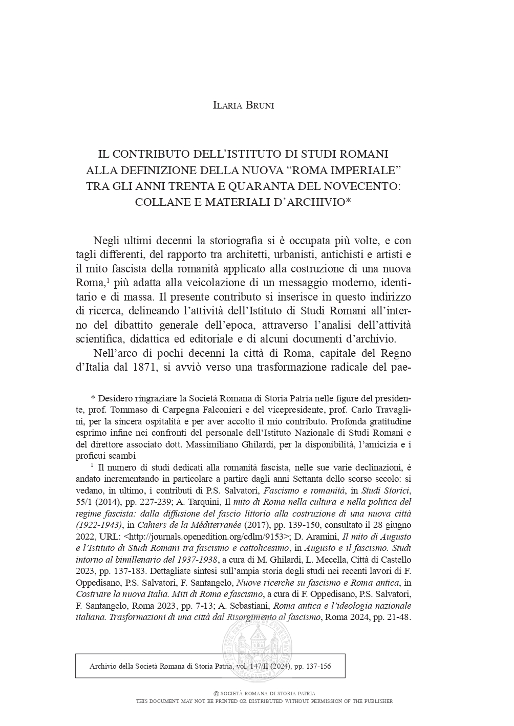 This paper analyses the role of the Institute of Roman Studies in shaping the concept of ‘Imperial Rome’ as promoted by the Fascist regime during the 1930s and 1940s. Founded in 1925 by Carlo Galassi Paluzzi, the Institute observed Rome’s transformation from an administrative capital into a symbol of the new empire. Through courses, conferences and publications, including the series “Volumi della Roma di Mussolini” and “Quaderni della Roma di Mussolini”, it contributed to the dissemination and propaganda of the myth of the new Romanity. Topics covered include archaeological issues, urban planning, physical and biological sciences, economic aspects, in- frastructure protection systems, and land reclamation projects. The authors included some of the most prominent architects, engineers, economists, historians and archaeologists of the time. The Institute’s historical archives contain documents that demonstrate the extensive communication between the Institute and scholars, political bodies, and the most significant newspapers and trade magazines. The president relied on these entities to disseminate the outcomes of the debates to a broader audience. Following the collapse of the regime, the project was suspended; however, the surviving editorial output remains a valuable resource for understanding the contradictions of the period and the impact of urban transformations on the contemporary landscape.
